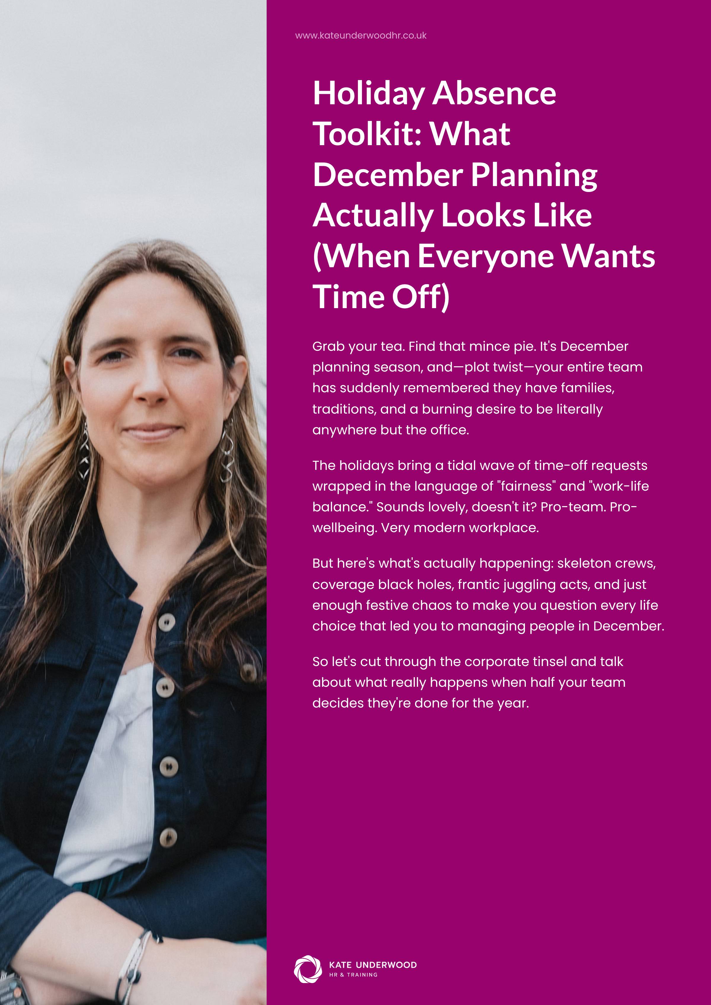 I’m Kate Underwood, the straight-talking HR partner behind Buzzing About HR. I help SMEs run fair, daylight-proof people practices that work in the real world — particularly when December chaos hits.